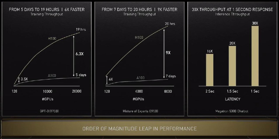 下面看看 H100 在具体任务上的性能提升:单看 GPU 算力的话训练 GPT-3 速度提升 6.3 倍,如果结合新的精度、芯片互联技术和软件,提升增至 9 倍。在大模型的推理工作上,H100 的吞吐量是 A100 的 30 倍。