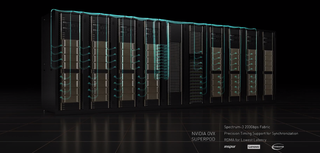 然后,英伟达利用 Spectrum-3 200 Gpbs 交换机连接 32 台 OVX 服务器构成了 OVX SuperPOD。