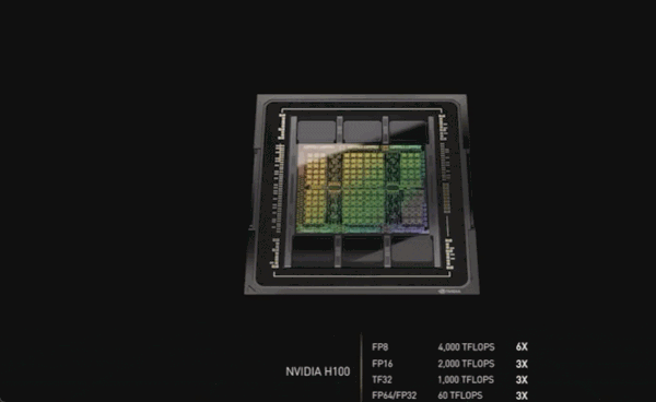 虽然比苹果 M1 Ultra 的 1140 亿晶体管数量要小一些,但 H100 的功率可以高达 700W——上代 A100 还是 400W。「在 AI 任务上,H100 的 FP8 精度算力是 A100 上 FP16 的六倍。这是我们历代最大的性能提升,」黄仁勋说道。