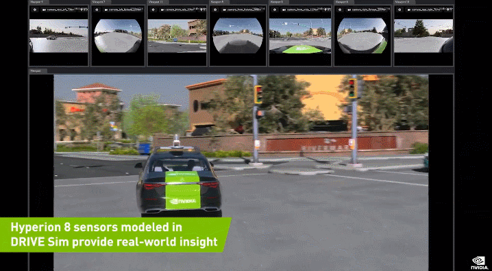 DRIVE Sim 中构建的 Hyperion 8 传感器可以提供真实世界的视图。
