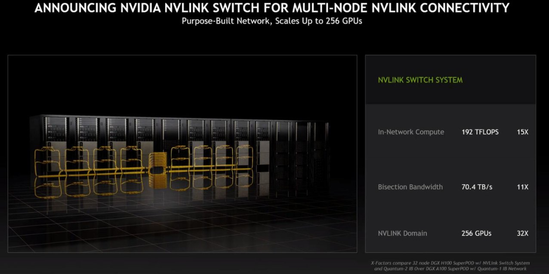 新的 NVLINK Swith System 又可以最多把 32 台 DGX H100 直接并联,形成一台 256 块 GPU 的 DGX POD。