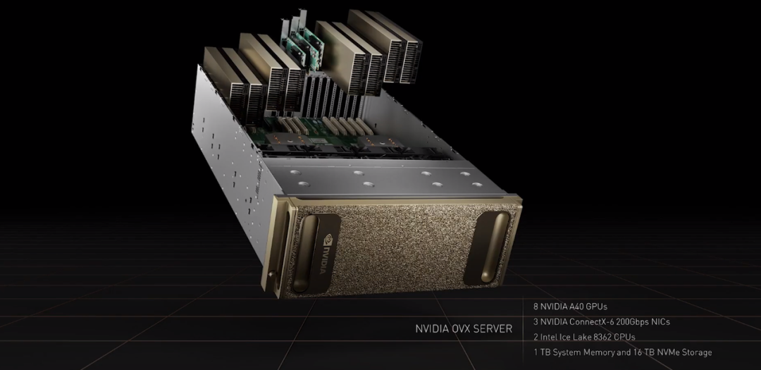 第一代 NVIDIA OVX Omniverse 计算机由 8 个 NVIDIA A40 GPU、3 个 NVIDIA ConnectX-6 200 Gbps 网卡、2 个 Intel Ice Lake 8362 CPU 以及 1TB 系统内存和 16TB NVMe 存储组成。