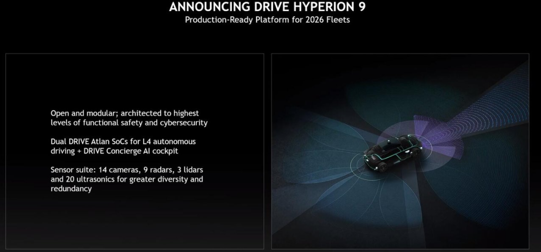 今天,英伟达宣布 Hyperion 9 将从 2026 年起在汽车上搭载。相较于前代,Hyperion 9 将拥有 14 个摄像头、9 个雷达、3 个激光雷达和 20 个超声传感器。整体而言,它处理的传感器数据量是 Hyperion 8 的两倍。