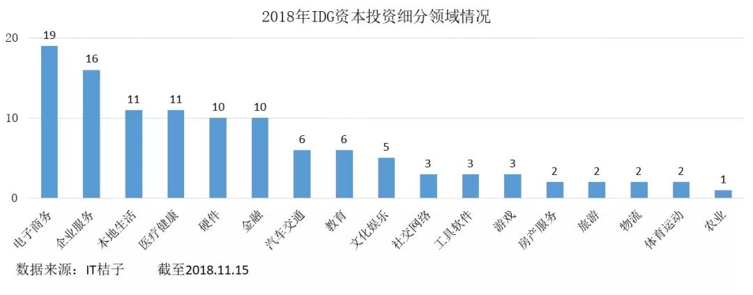 IDG 资本今年在电子商务和企业服务领域的投资依旧保持着一惯性。除此之外,IDG 资本在医疗领域的投资比重有所增加,截至 2018 年 11 月 15 日,2018 年 IDG 资本在医疗领域的投资已达 11 起,包括 AI 辅助影像诊断公司迪英加、医疗大数据公司思派网络、线下口腔诊所极橙齿科等等多方向医疗创业公司。