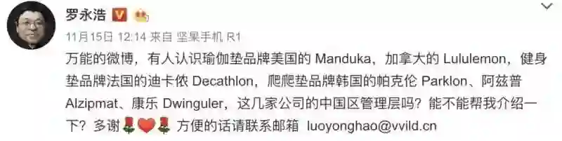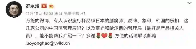 从11月15日开始,罗永浩连续三天发布微博求助,寻求认识诸多消费品牌的中国区管理层。此前罗永浩曾在微博上透露,12月将召开发布会,新品既不是电子烟、手机,也不是家电和智能家居产品,对于罗永浩即将发布的新品,不禁引起了众多网友的猜测。(微博)