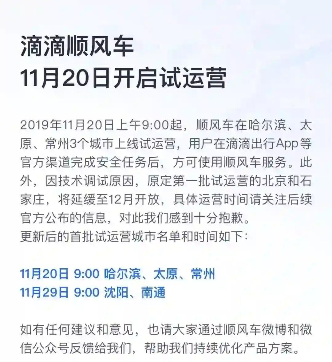 11月19日消息,滴滴顺风车在滴滴出行App内更新试运营公告,宣布今天(11月20日),顺风车将在哈尔滨、太原、常州3个城市上线试运营。