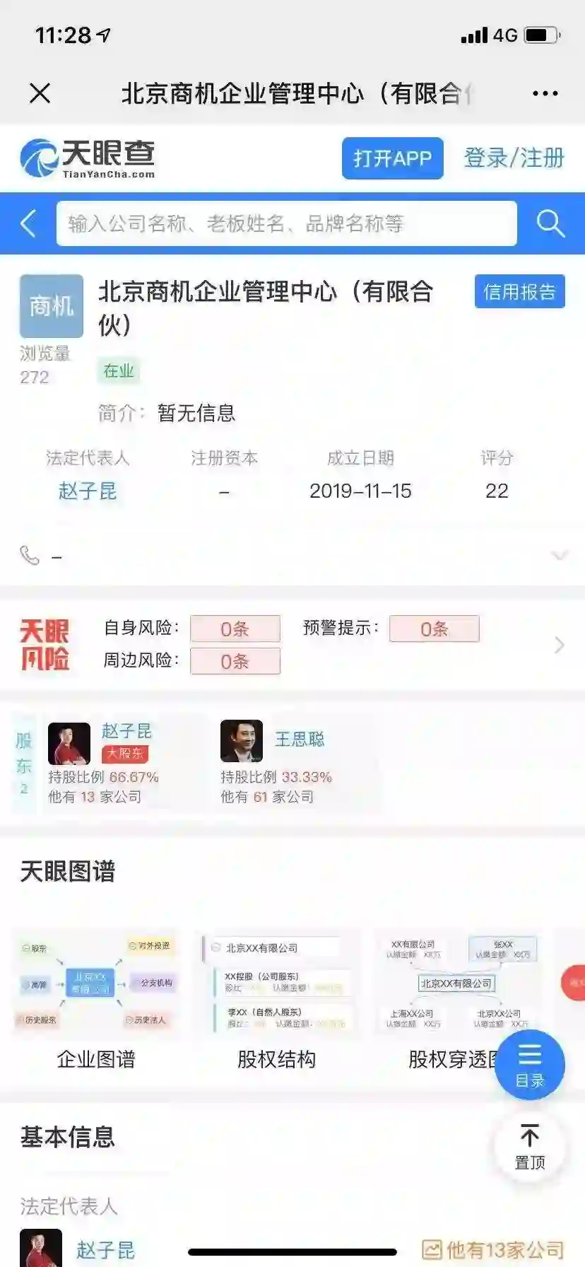 11月18日,天眼查数据显示,王思聪新增对外投资,入股北京商机企业管理中心(有限合伙),持股比例33.33%。该公司成立于2019年11月,经营范围包括企业管理、经贸咨询、企业咨询。王思聪目前共在33家企业担任股东,其中3家为注销状态。(天眼查)