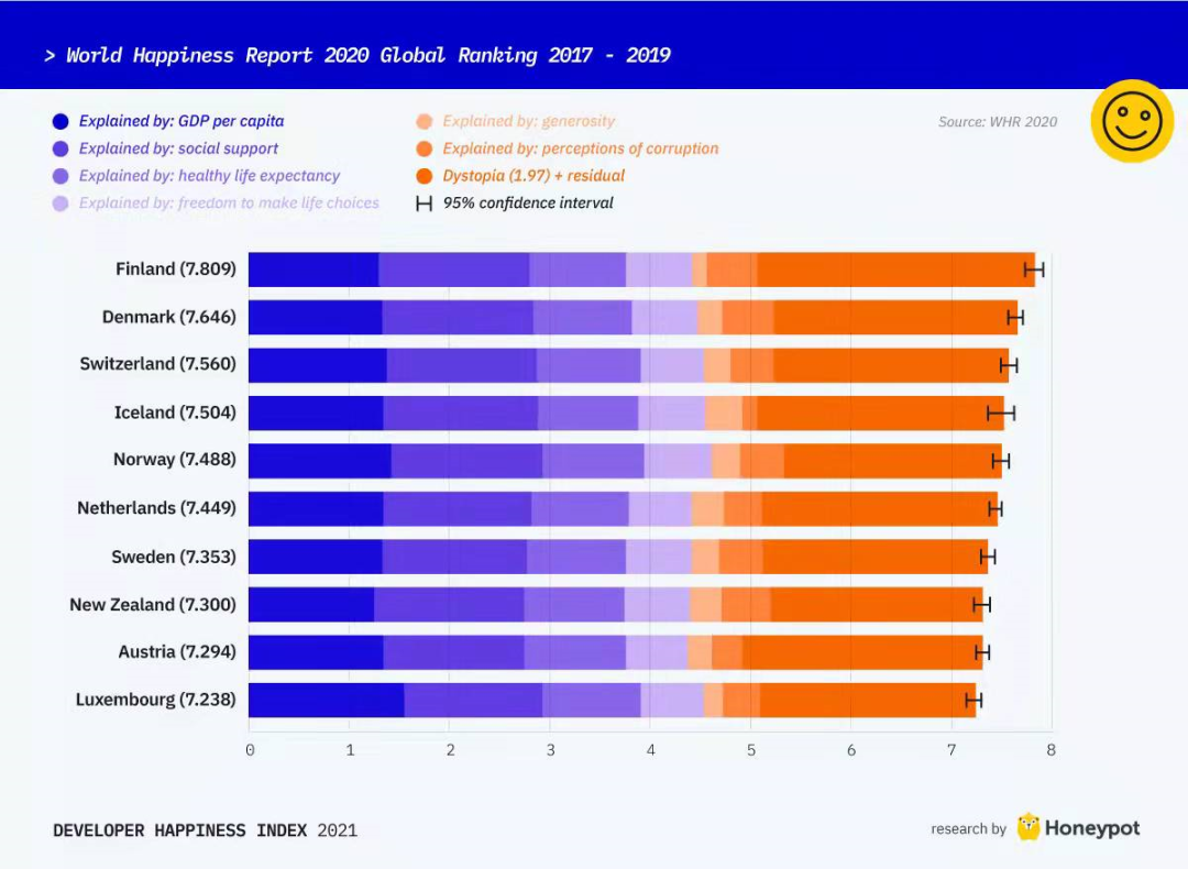 工作对幸福的重要性不仅适用于开发人员。报告发现,对于开发者而言,快乐的工作与快乐的国家非常相似:稳定的领导力、自主性以及成就感。