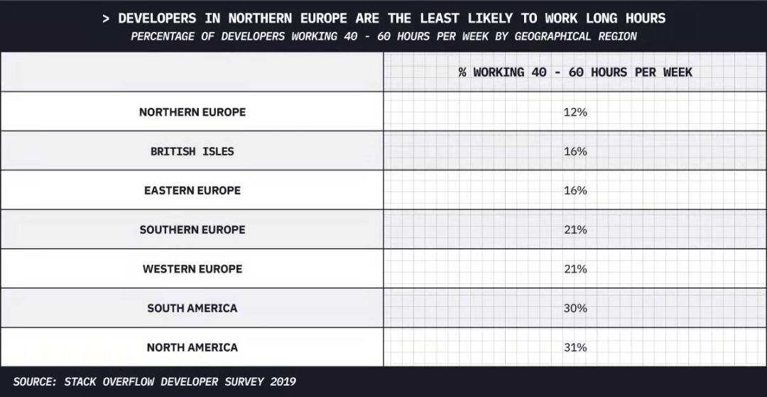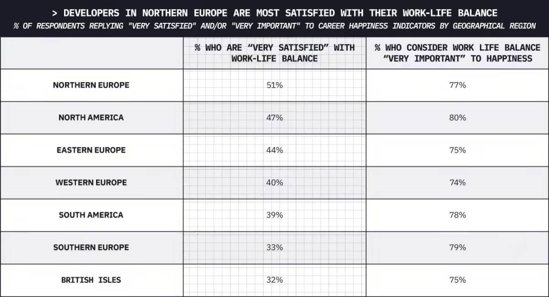 位于北欧斯堪的纳维亚和北欧国家的一半以上的开发人员对他们的工作与生活平衡非常满意,高于世界其他任何地方。与所有其他地区的开发人员相比,他们的平均工作时间也更短(以每周工作40—60小时的百分比衡量)。