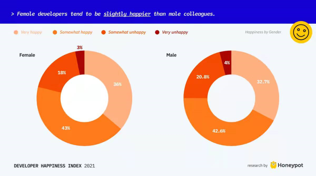 此外,女性开发者比男性开发者稍微快乐一些,尽管这两组数据之间只有很小的差异。