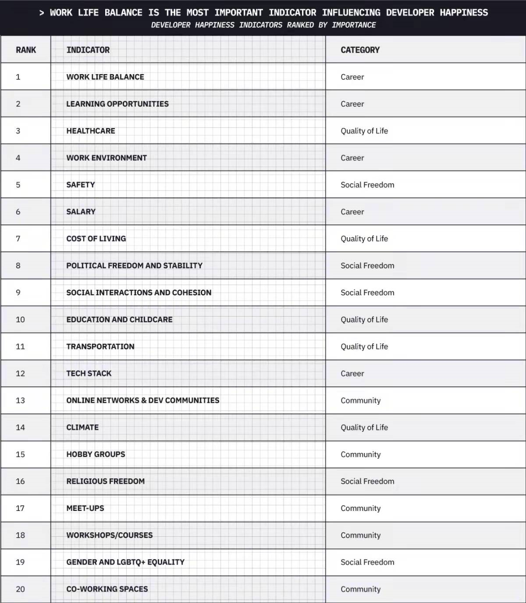 职业指标的重要性排名很高。幸福感排名前五的指标中的三个与开发人员的职业有关——工作与生活的平衡、学习机会和工作环境。