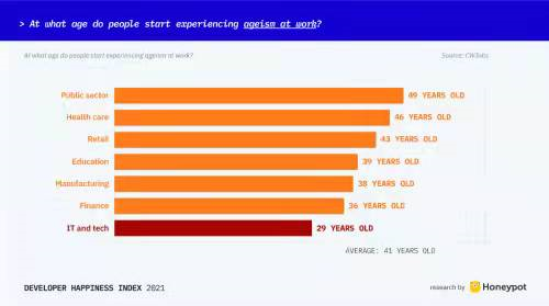 这暗示了科技行业更广泛的年龄歧视趋势。根据CWjobs的研究,技术专业人员开始经历年龄歧视的平均年龄(在英国)为29岁,而各行业的平均年龄为41岁。