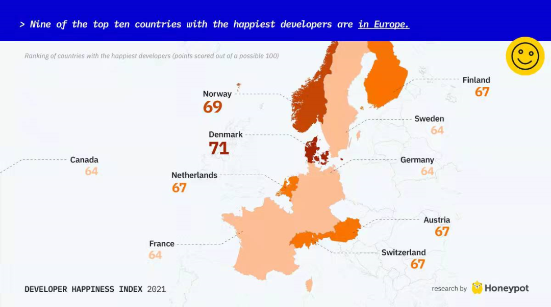 根据开发者所处位置的不同,他们在评估自己幸福度的方式上存在巨大差异。在全球范围内,北欧和西欧国家是让开发者最幸福的国家。