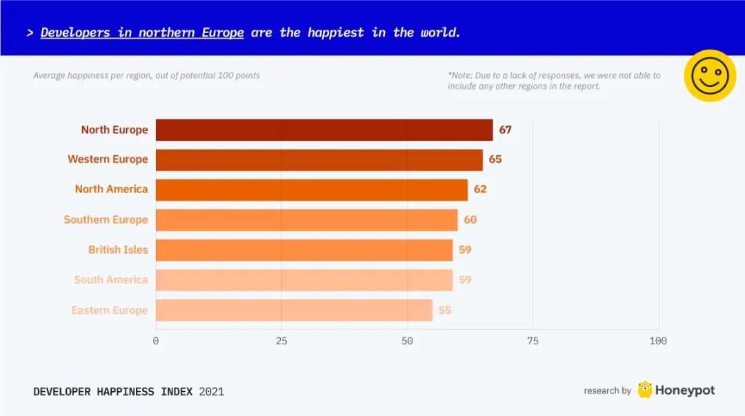 工作中最快乐的开发人员生活在北欧的斯堪的纳维亚国家。工作中最不快乐的人居住在南欧。
