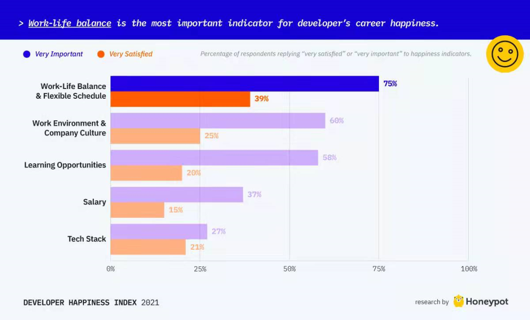 无论经验、年龄、性别、职位和地区,工作与生活的平衡是开发者工作幸福感的最重要指标。75%的开发者认为这个因素“非常重要”,39%的开发者认为自己“非常满意”。