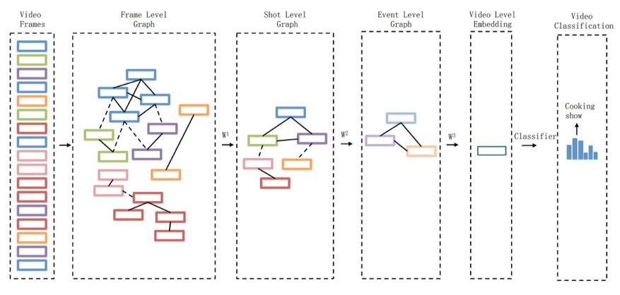 图注:视频帧序列依次构建视频帧级别、镜头级别和事件级别的图。选自 arxiv: 1906.00377。