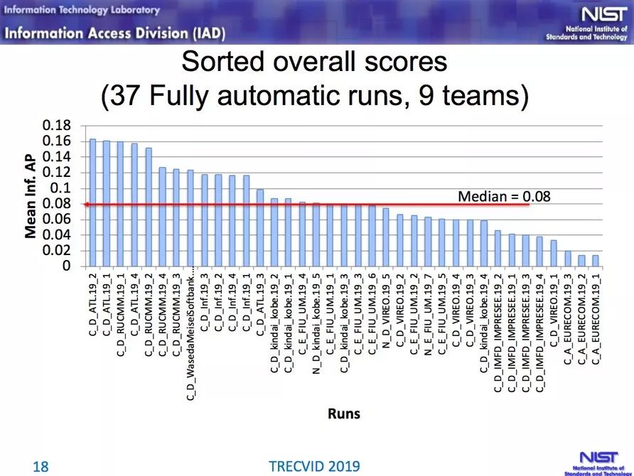 阿里安全图灵实验室视频理解团队 ATL 获得的评分最高,人民大学、软银等团队也有很好的成绩。选自:https://www-nlpir.nist.gov/projects/tvpubs/tv19.slides/tv19.avs.slides.pdf