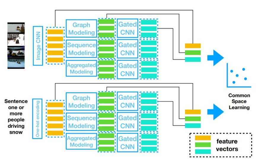 第二阶段的编码分别由图卷积、循环神经网络、聚合模型得出,它们相当于从不同的角度获取视频帧之间或词之间的相互依赖关系。最后第三阶段的编码则通过门控卷积网络挑战三类特征的重要性,并输出最终的嵌入向量。