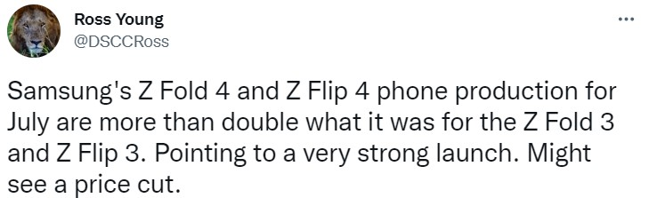 爆料者 Ross Young 在海外社交平台透露称,三星在 7 月份的 Galaxy Z Fold 4 和 Z Flip 4 手机产量是上一代同期产量的两倍,预计这一代的 Galaxy Z 系列折叠屏手机售价将降低。此外,还有消息显示,三星 Galaxy Z Flip 4 的电池将由 LG 供应;有行业人士认为,这一举措有望降低生产成本、提高利润率,手机的售价也有望降低。目前 Galaxy Z Fold 4 的一款电池已经通过了认证,但该电池的容量有可能会变得更小。
