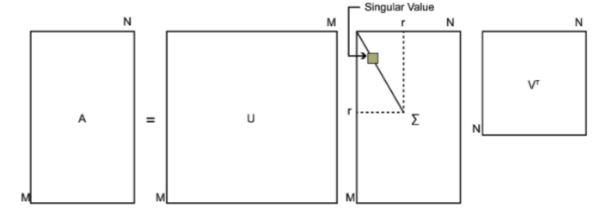 其中U是一个m×m的矩阵,Σ是一个m×n的矩阵,除了主对角线上的元素以外全为0,主对角线上的每个元素都称为奇异值,V是一个n×n的矩阵。U和V都是酉矩阵,即满足U^TU=I,V^TV=I。下图可以很形象的看出上面SVD的定义: