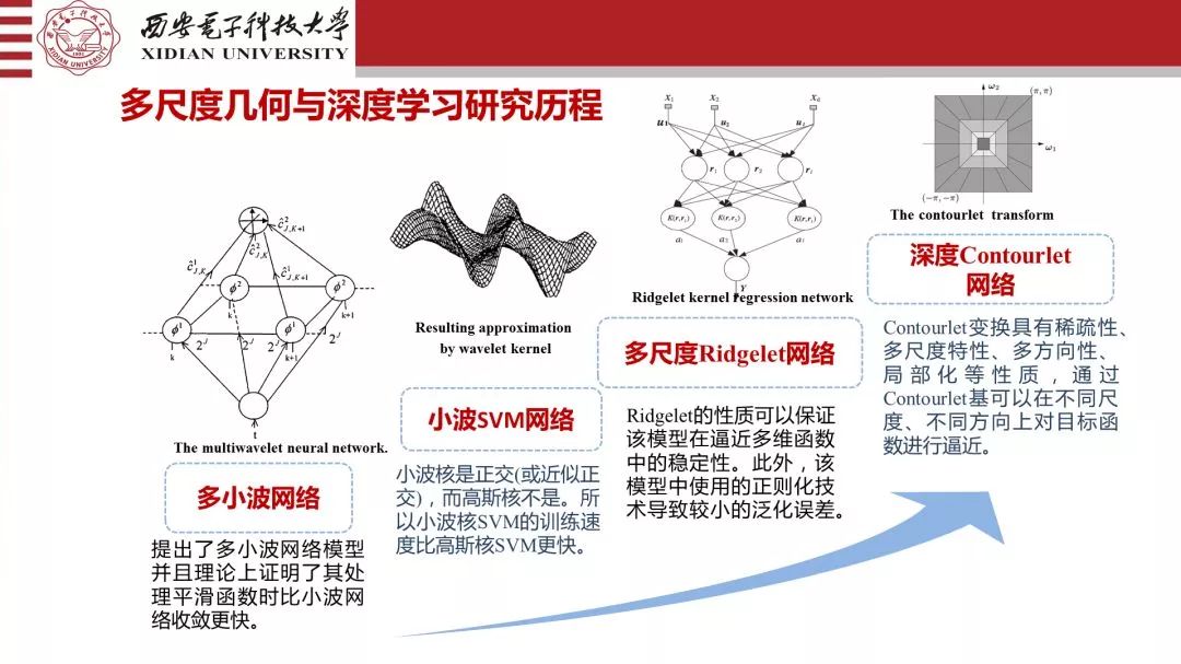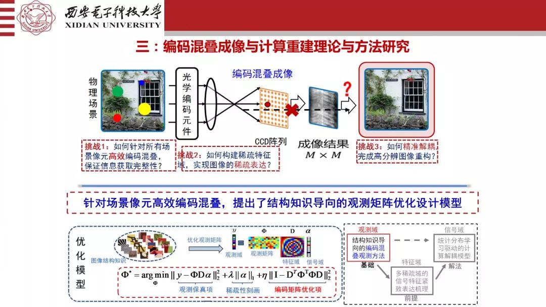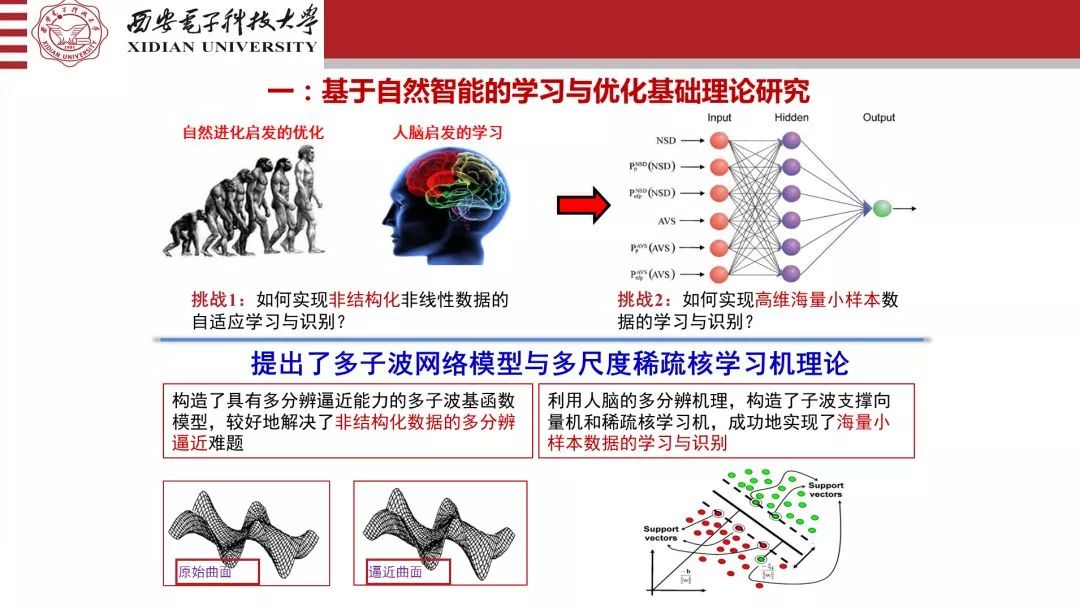 将学习和优化结合起来,多小波和多尺度的网络模型是我们自己提的。多小波的大概是30年前就提了这样的事情。协同进化优化学习,这是第一个国奖,解决了优化和学习的一些基础性的问题。第二个找到了这些图像,需要表征,找到了这些特征,而且把中间的机理分析了,给出了重构的模型。第三个国奖就是找到了怎么编码,怎么稀疏。而且优化了模型,求解了,一代二代三代做了。那好,这就是这三个国奖。近五年拿的,都在人工智能领域。所以围绕的都是这样的问题去做的。