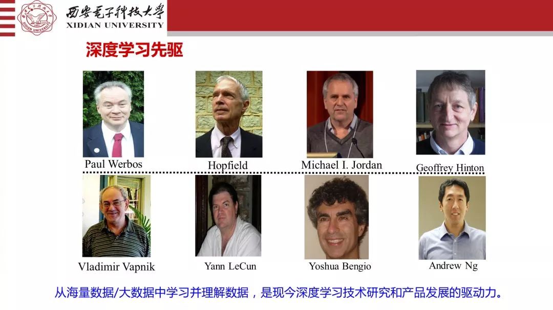 关于神经网络和专家系统,专家系统三个要点要记住:知识的表示,知识的学习,知识的推理。早期推理知识的办法不多、表征的框架不多、手段不多。神经网络给了大家思想和方法,我希望大家记住对神经网络真正有贡献的是这些人,43年Hebb规则和MP模型。1962年Widrow和他的学生提出了LMS。第一台PC机是他发明的,其算法奠定了自适应信号处理和自适应控制技术基础。这个是俄罗斯籍的斯坦福的教授,这个人记住,其貌不扬,我觉得大家都应该记住他Werbos,BP算法是他提出来的,1974年在哈佛大学拿博士学位的时候,就发表了一篇论文就没有论文了,但是博士学位是拿到了,真正的BP算法是他提出来的,使三层神经网络可学习。整个大概十几年的时间很红火,而且是自己也做过世界神经网络学会的主席和先驱,加州工学院Hopfield,三篇文章奠定了他的基础。另外一个记住一个C.Mead,美国的三院院士,世界第一块神经网络的芯片是他做的,这个人在集成电路一直是明星,大家一定要记住这件事情,神经网络不仅是今天。这个是芬兰皇家科学院的院长T.Kohonen教授,他来过很多回,提出了自组织特征映射网。径向基神经网络出自Billing手,因为他是用基函数来做这件事情,做控制的人全部是用的,很高效。支撑向量机,这些都是神经网络模型,而且都是学习机,大家不要认为是完全跟神经网络没有关系,只是说那一阵跟神经网络“划清界限”。浅层到深层的学习,大家要明白,本质性上改变的是什么?你说前面的网络浅,那在哪里深呢?规模深、特征深、还是机理深?还是怎么做的呢?我说理解深度的时候,我们要去做深在什么地方,对数据的匹配在哪些上面是做了本质性的突破和改变,这件事情上我们一定要去做的。