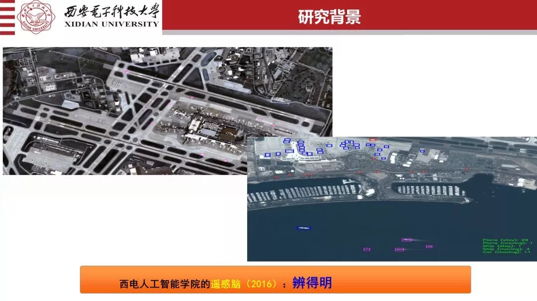 大家可能看不见,这是星载的,就是照相机和雷达装在卫星上然后拍摄地面的视频,船在动、高速上面的车在动、然后机场的飞机在起飞,这是卫星的视频。卫星视频数据量非常大也非常高维,我们同时做到了在卫星视频数据量级上的舰船、飞机、车辆的监测、跟踪和分类,就是你传送多少、运动速度多少、未知的信息全部能够同时的实时识别出来。