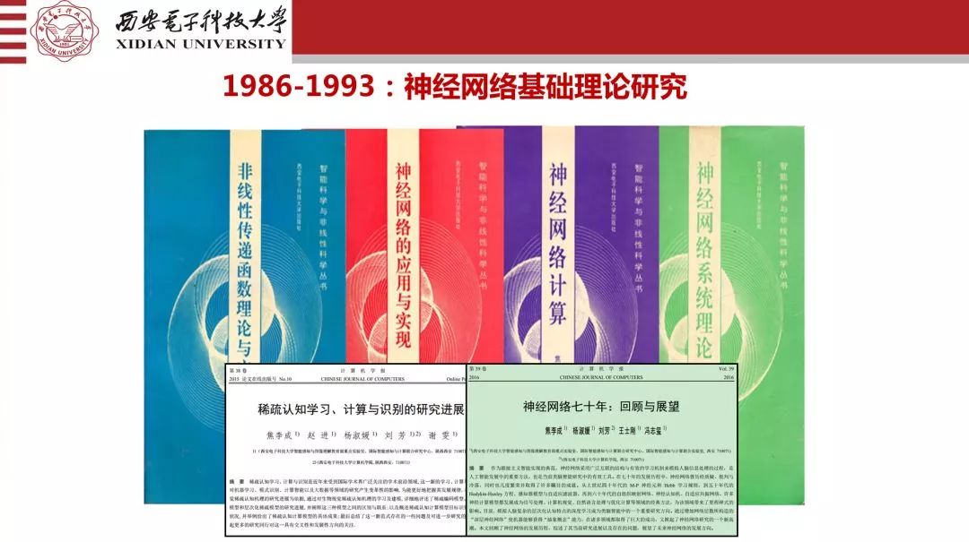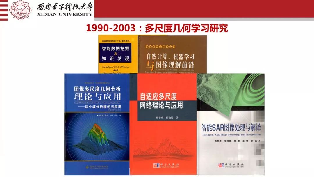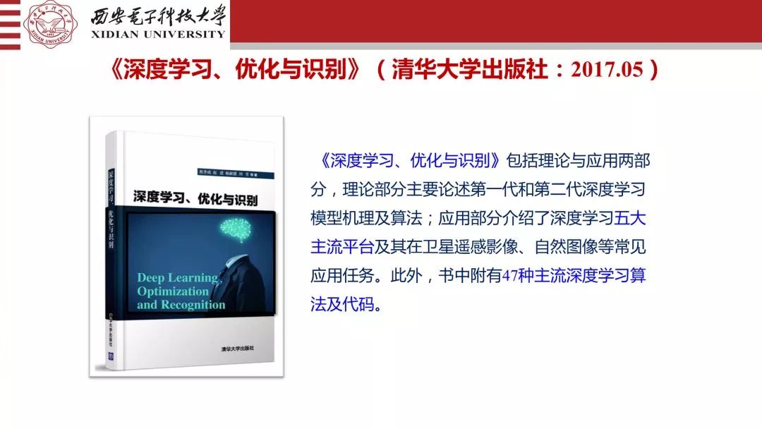 我们一直不说,但是路一直在走。简单的数据到了具体的对象,到了图像,从小波变换到了小波网络,从伸缩平移到了方向,到了图像旋转变换。所以说包括从地上到了天上,到了空中机载的。对象在变,需求在变,神经网络也好,机器学习也好,方法也在不断的往前走。所以我们是把这个结合起来在走。刚才为什么说我希望讲一下这些道理,因为进化计算的第一篇文章,不叫人工智能,是优化和学习在走,包括免疫的学习优化,包括我们用到多目标上面去做,包括做协同的、量子的,而且用到了真正目标的识别上,我们都做了。这个过程我们回过头来说,对于人工智能人才的培养,为什么我们心里面不太慌,经过了十四五年的实践和培养,反正我们也出了这些书,不敢说水平有多高,但是研究生,本科的教材是有参考的,我自己写的,我也在不断的更新。我们几十本书,应了人才培养教材之需,去年就包括做量子的,光学的,红外的,包括到认知的,稀疏的,一直到高分辨遥感,老先生一定要改成雷达图像,我们一路走过来,今年完成的是量子计算,计算智能,简明人工智能等七八本,大概也有好几十万字。计算智能还有模式识别,反正都是在50、60万字以上,还有自然计算的前沿,就是相当于深度学习的前沿,还有一个大数据智能挖掘的。