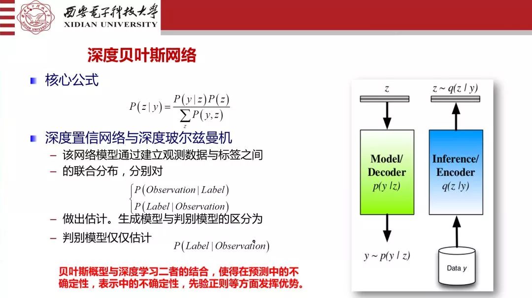分布完了以后,参数少。接下来就是可学习,这个参数我们可以学出来,学习关键的参数,那么这个分布就找到了,或者优化的分布就找到了。实际上就是做了一个分布的估计。贝叶斯的描述、表征,估计和深度结合起来,这是贝叶斯网络火起来最重要的原因。很自然,大家好不容易抓住一个贝叶斯分布,而且可以去做。深度可以给你学,何乐而不为,大家一定要找到一个结合点!