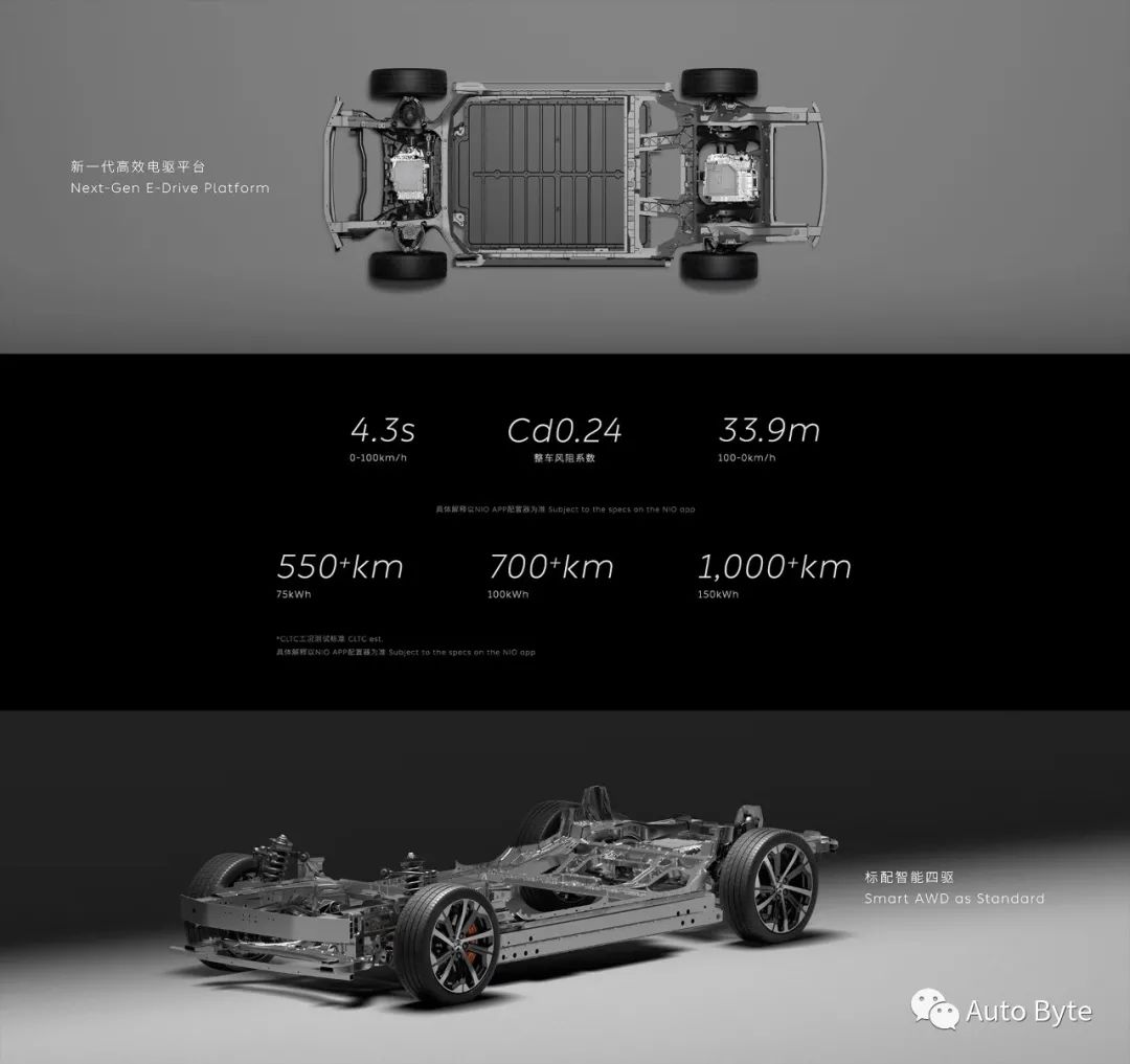 动力方面,ET5全系均采用前永磁同步电机+后感应异步电机的方案,配合碳化硅功率模块的新一代高效电驱平台,整车最大功率360kW, 峰值扭矩700 N·m,零到百公里加速4.3秒,百公里刹停33.9米。