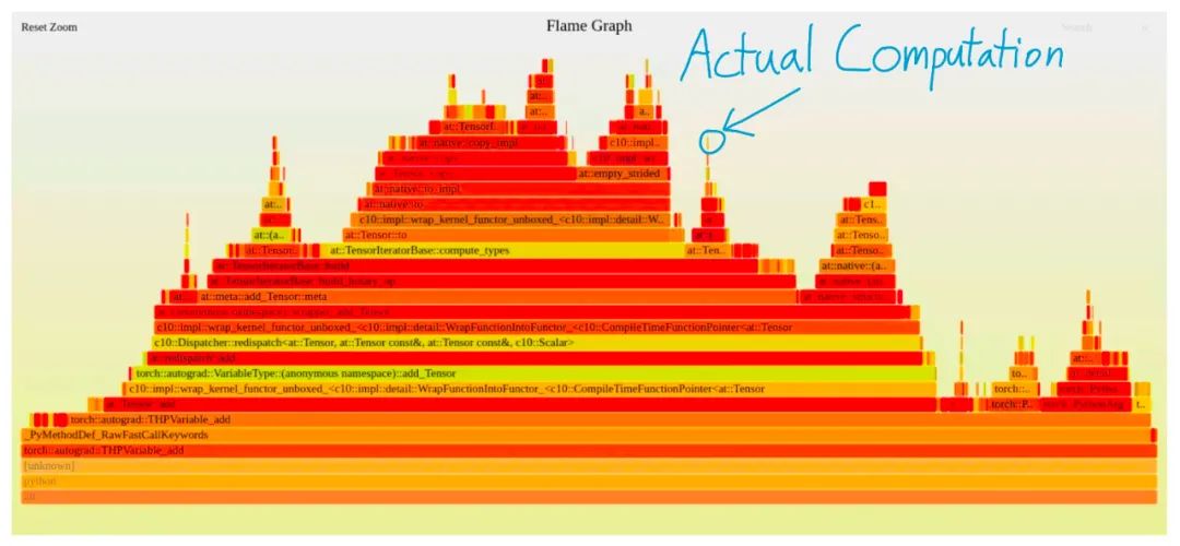 例如在下图中,使用 PyTorch 执行单次添加,仅有一小块图是实际执行计算的内容,其他的部分都是纯粹的额外开销。