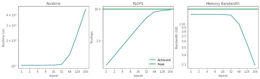 并使用融合编译器对其进行基准测试,就可以计算每个 repeat 值的 FLOPS 和内存带宽。增大 repeat 值是在不增加内存访问的情况下增加计算量的简单方法 - 这也称为增加计算强度 (compute intensity)。