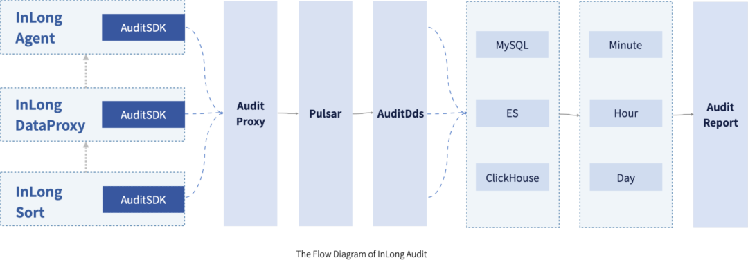 InLong Audit 是独立于 InLong 的配套服务,主要用于对 InLong 全链路的 Agent、DataProxy、Sort 模块的入条数、入流量、出条数、出流量等进行实时审计对账,查看数据流是否有丢失或者重复,方便快速定位数据和服务异常。目前 InLong Audit 对账的粒度有分钟、小时、天三种粒度。InLong Audit 的整体架构图,可以参考下方: