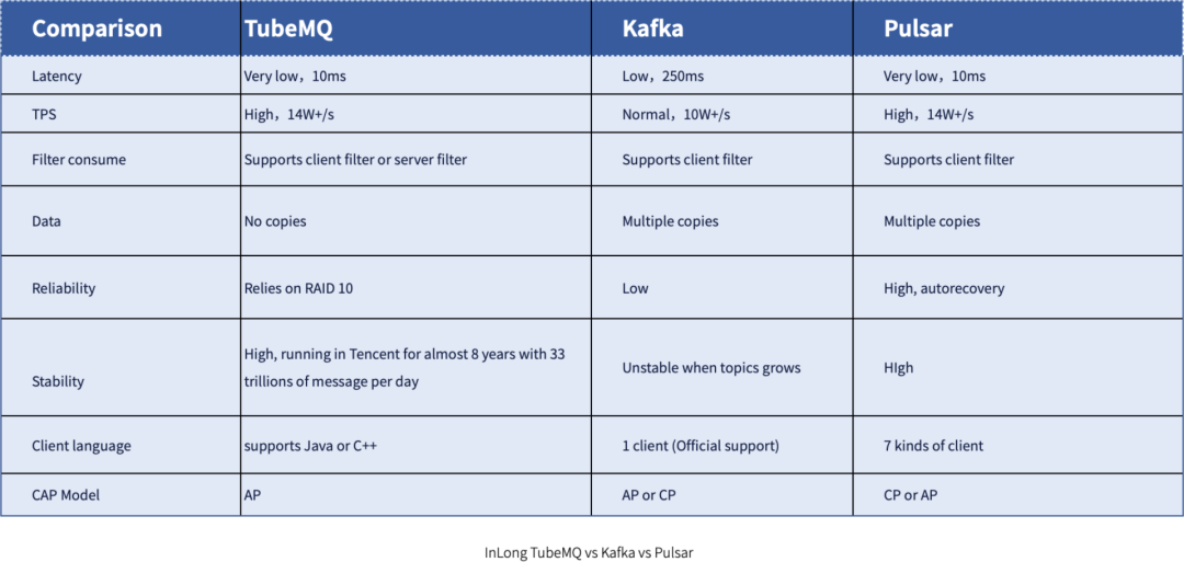 在 TubeMQ 的设计里,分区故障并不影响 Topic 的整体对外服务,只要 Topic 有一个分区存活,整体的对外服务就不会受阻。同时,TubeMQ 的数据时延 P99 可以做到毫秒级,这样保证了业务可以尽可能快的消费完数据,做到尽可能不丢。另外,TubeMQ 独有的数据存储方案设计性能要比 Kafka 的 TPS 至少高出 50% 以上(有些机型上还是翻倍的效果),同时借助存储方案的不同,单机容纳的 Topic 数和分区数更多,进而可以使得集群规模更大,减少维护成本。下图给出了 InLong TubeMQ 和 Kafka、Pulsar 的全方位对比: