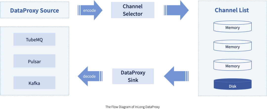 相比较其他数据集成解决方案,InLong 架构最明显的区别,在数据采集和消息队列中间,多了一个叫做 DataProxy 的服务。InLong DataProxy 主要有连接收敛、路由、数据压缩和协议转换等作用。DataProxy 充当了 InLong 采集端到消息队列的桥梁,当 DataProxy 从 Manager 模块拉取数据流元数据后,数据流和消息队列 Topic 名称对应关系也就确定了。当 DataProxy 收到消息时,会首先发送到 Memory Channel 中进行压缩,并使用本地的 Producer 往后端 Cache 层(即消息队列)发送数据。当消息队列异常出现发送失败时,DataProxy 会将消息缓存到 Disk Channel,也就是本地磁盘中。InLong DataProxy 整体架构基于 Apache Flume,扩展了 Source 层和 Sink 层,并对容灾转发做了优化处理,提升了系统的稳定性。下图为 DataProxy 数据处理流程: