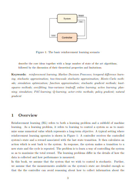 强化学习是一种学习范式,它关注于如何学习控制一个系统,从而最大化表达一个长期目标的数值性能度量。强化学习与监督学习的区别在于,对于学习者的预测,只向学习者提供部分反馈。此外,预测还可能通过影响被控系统的未来状态而产生长期影响。因此,时间起着特殊的作用。强化学习的目标是开发高效的学习算法,以及了解算法的优点和局限性。强化学习具有广泛的实际应用价值,从人工智能到运筹学或控制工程等领域。在这本书中,我们重点关注那些基于强大的动态规划理论的强化学习算法。我们给出了一个相当全面的学习问题目录,描述了核心思想,关注大量的最新算法,然后讨论了它们的理论性质和局限性。