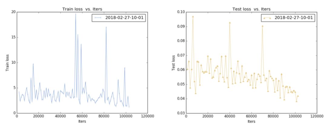 Train loss 大概是在 0.005~0.006,Test loss 是在 0.007~0.008(注:训练的时候 loss_weighs 设置为 100,因此上图数量级上不一致)