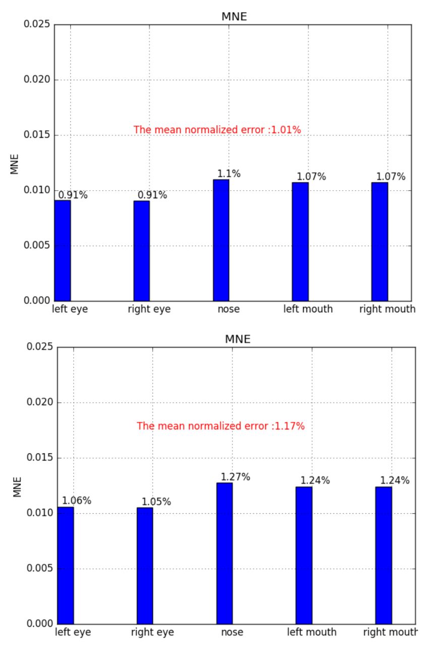 这里采用相对误差作为评价指标,相对误差计算公式为:,其中表示输出 landmark 与真实 landmark 的欧氏距离,表示图片对角线的长度。一开始,本实验采用的是双眼距离作为归一化因子,但是 CelebA 数据集并不适合采用双眼距离作为归一化因子,因为在计算时会出现 inf!即两眼在同一位置,导致分母为零,这是 LFW,ALFW 数据集不会出现的情况。两眼距离为零的图片示意图;