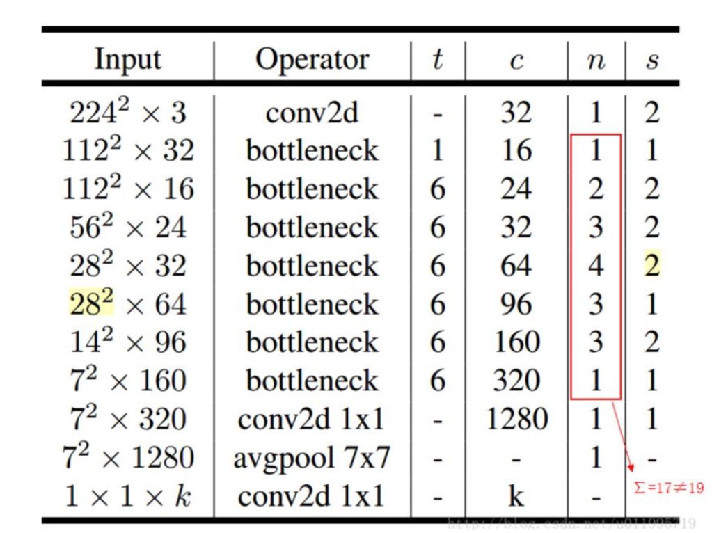 2. 文中提到共计采用 19 个 bottleneck,但是这里只有 17 个。