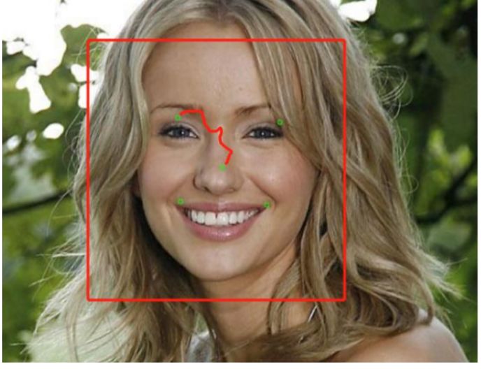 level_1 训练完毕,需要进行图片裁剪,以供 level_2 进行训练。这里采取的裁剪策略为,以 level_1 预测到的鼻子为中心,裁剪出一个正方形,这个正方形的边长为四倍鼻子到左眼的距离。以下图为例,绿色点为 level_1 的预测关键点,红色方框即为裁剪框:
