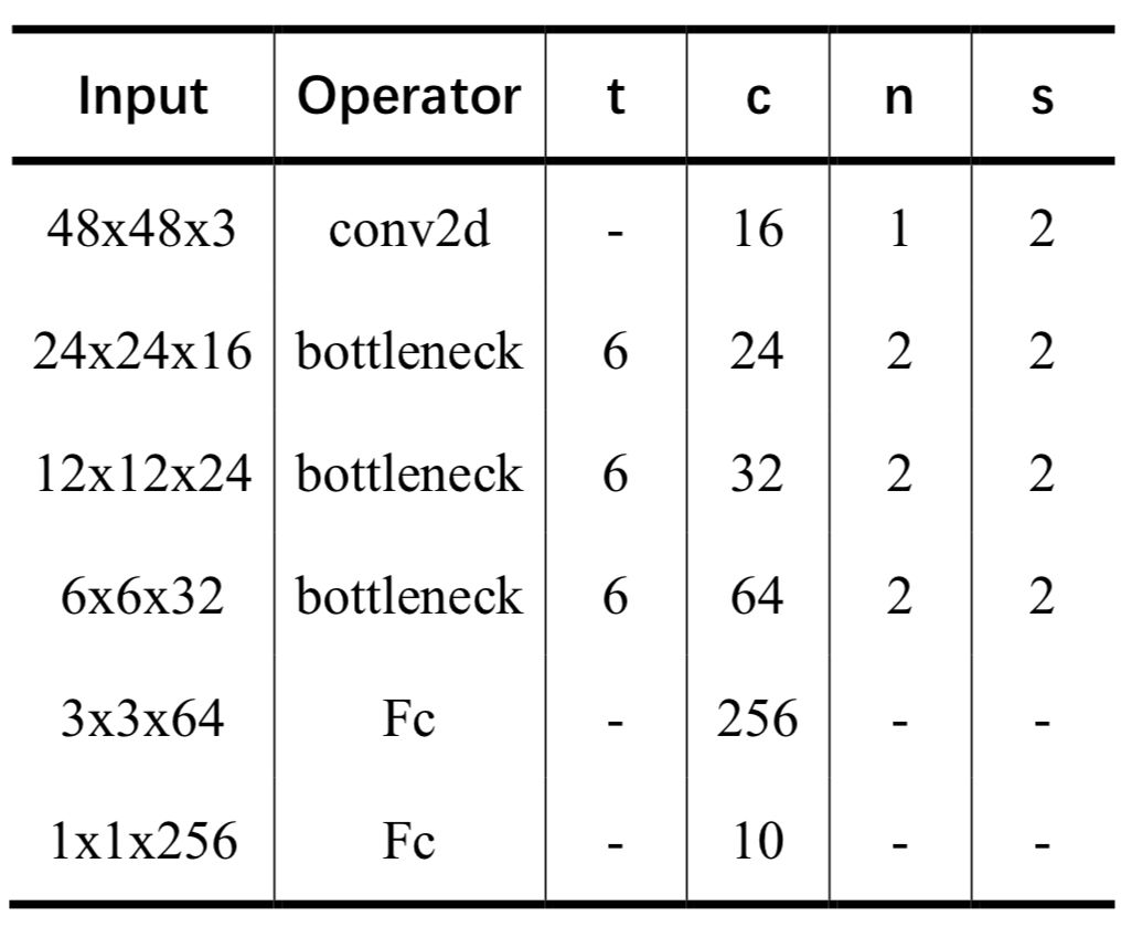 结合本实验任务的需求,设计了一个输入尺寸为 48*48 的 MobileNet-V2(level_1 和 level_2 均采用此网络结构),网络结构如下图所示: