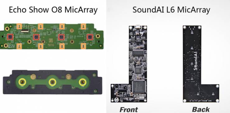 Echo Show则采用了椭圆形麦克风阵列,国内一般也称为跑道形,其实就是双线形,如下图左所示。这个阵型因为Echo Show的厚度问题所做了折衷处理,也是典型的技术妥协于产品设计的案例。目前,国内只有声智科技供应类似阵型,即L型6麦阵列,见如下图右所示。