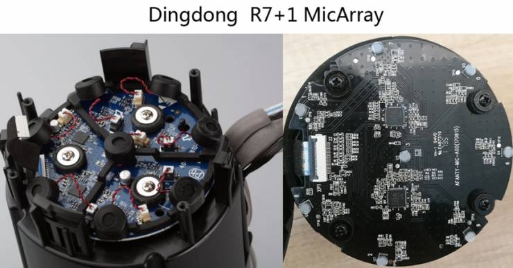 这里再说一下科大讯飞,其叮咚音箱系列产品都是模仿的这种结构,讯飞增加了1个麦克风,形成了环形7+1麦克风阵列的结构,如下图所示。叮咚1代和2代的差别主要是1代采用的是驻极体麦克风,而2代换成了模拟的MEMS麦克风。相比Amazon来说,科大讯飞更喜欢科胜讯的芯片,1、2代叮咚产品全部采用科胜讯的AD芯片CX20810,另外,科大讯飞的双麦算法也是采用的科胜讯CX20921芯片。