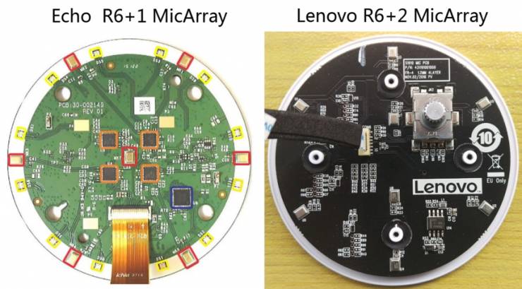 不管第一代还是第二代,Echo都采用典型的6+1麦克风阵列结构,即环形6个麦克风搭配中间1个麦克风,如下图左所示。而且,Amazon一直非常喜欢采用TI的AD芯片TLV320ADC。目前,这种阵型国外主要是Amazon Echo使用,国内也只有联想和科大讯飞曾经模仿过这种阵型,其中,1代联想智能音箱采用的是环形6个麦克风+中间2个麦克风的结构。如下图右所示。