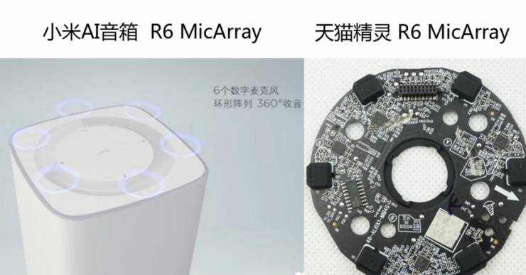 采用的是环形6麦方案,环形6麦的优点就是给产品ID设计更大的自由性,同时也兼顾了成本和远场语音交互性能。国内小米AI音箱采用声智科技的前端方案,其中的阵型就是环形6麦,同时为继续降低成本,麦克风也全部采用数字麦克风,这样就省掉了模拟麦克风必须搭配的AD芯片。国内采用这个阵型的还有天猫精灵、小雅音箱,然而,不同于小米AI音箱,天猫精灵为照顾算法因素,依然采用了模拟麦克风+TI ADC的方案。