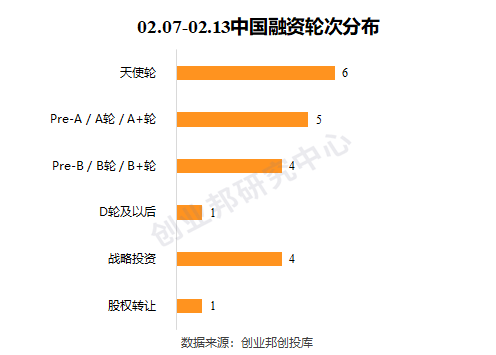 本周融资事件的融资轮次主要集中在前期(天使轮、A轮),共11起,其中天使轮有6起;战略投资本周有4起。