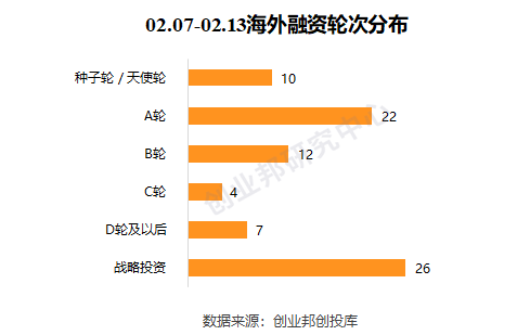 本周海外融资事件的融资轮次主要集中在前期(种子轮、天使轮、A轮),共32起;中后期(B轮、C轮、D轮及以后)有23起;战略投资有26起。