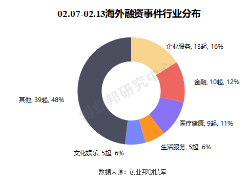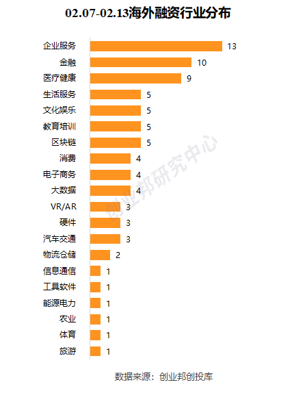 本周披露海外融资事件涉及20个行业领域,其中融资案例数量最多的五大行业分别是:企业服务、金融并列10起,医疗健康9起,生活服务、文化娱乐、教育培训、区块链并列5起。