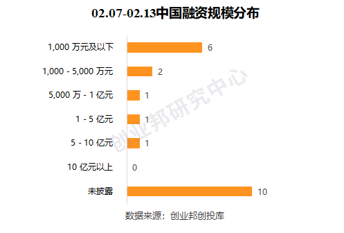 本周融资事件的融资规模在1,000万元及以下数量最多,有6起。