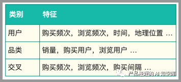 美团会把逻辑回归应用到业务中解决一些实际问题。这里以预测用户对品类的购买偏好为例,该问题可以转换为预测用户在未来某个时间段是否会购买某个品类,如果把会购买标记为1,不会购买标记为0,就转换为一个二分类问题。我们用到的特征包括用户在美团的浏览,购买等历史信息,见下表: